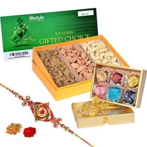 Rakhi is the occasion that best represents a brother & sister relationship. Surprise your brothers with the exclusive Rakhis offered by Giftcardsindia. This day of Rakshabandha reflects the silent pledge of morality, spirituality and respect to values and Indian culture. May the threads of love bring happiness for you and your brothers. Celebrate the joyous occasion of Rakhi with ?Perfect Rakhi Hamper? in aprecious designer pouch.